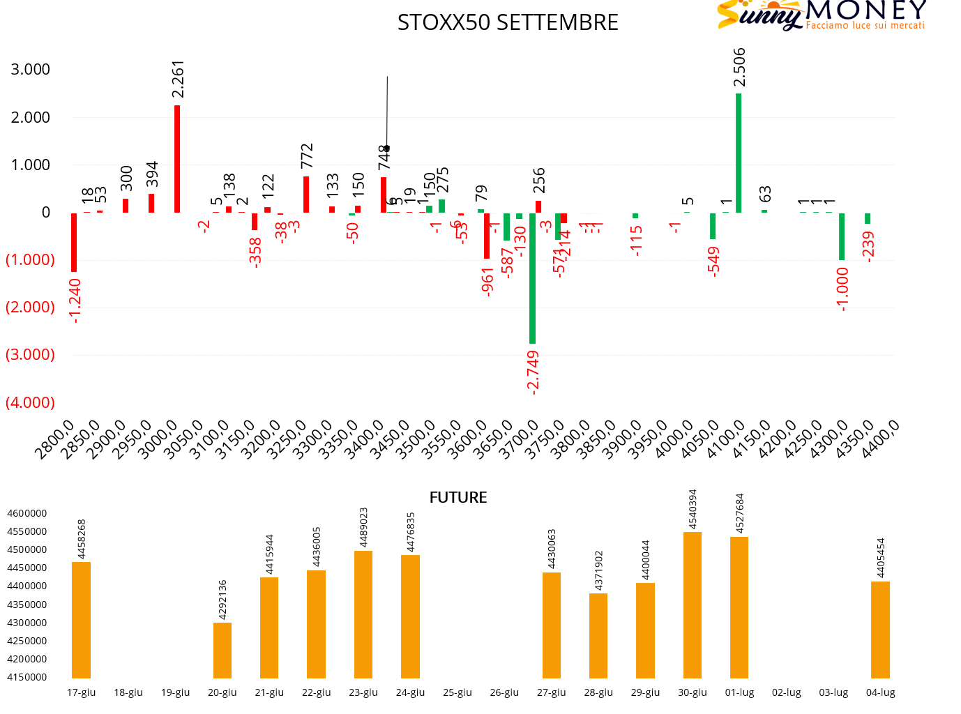 Su Eurostoxx50 chiusura di posizioni put a strike 3600 e nuove aperture a strike 3400 e 3250. Sul lato call nette chiusure di posizioni a strike 3700 e nuove aperture a strike 4100. Future in sensibile calo.