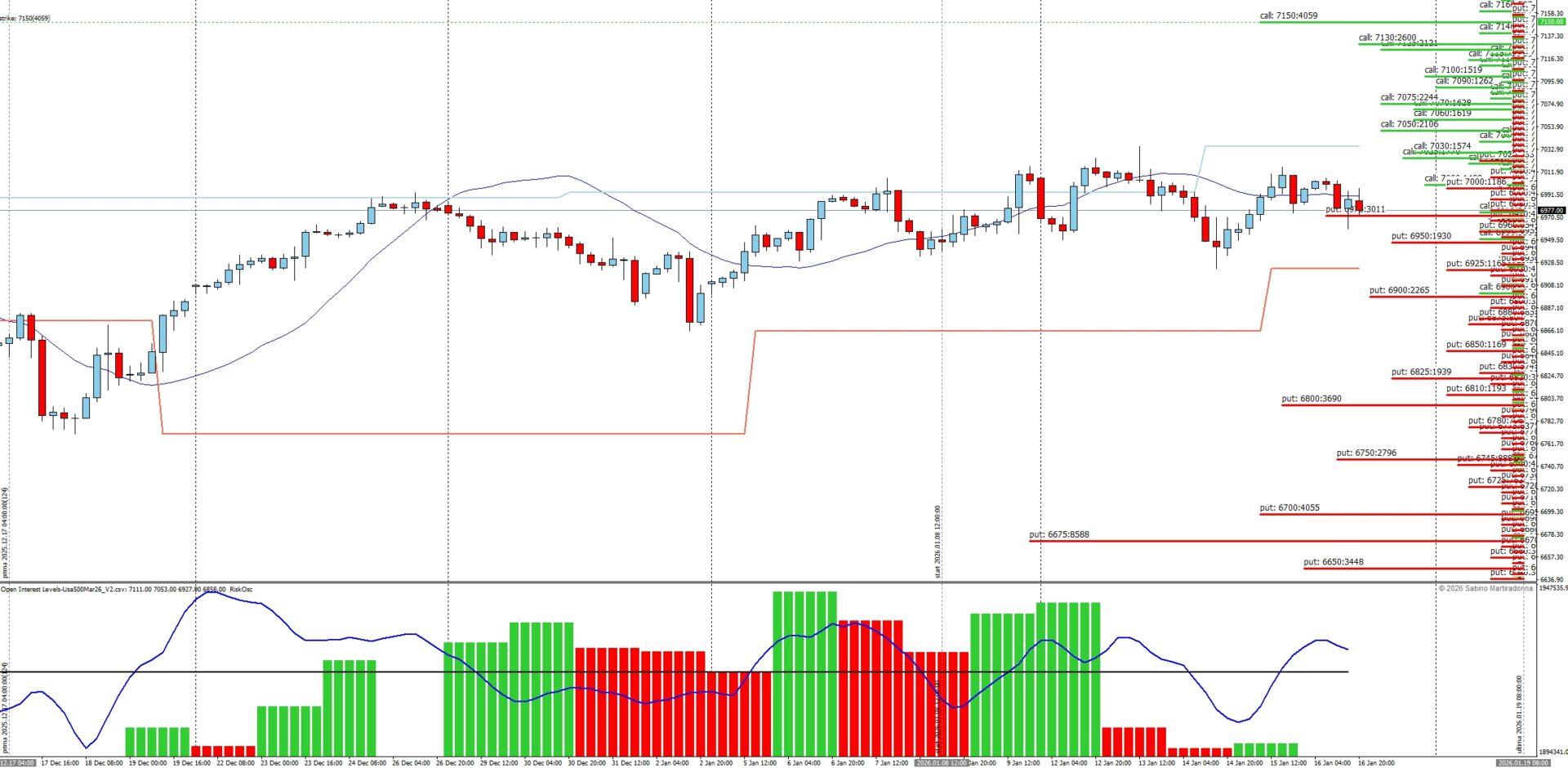 In tutti i casi il mercato è molto sostenuto dalla componente put che mostra livelli di posizionamenti netti ben precisi e che corrispondono ad aree gamma sensibili. Sul lato call i primi livelli di sensibilità al gamma iniziano ad essere evidenti sopra 7025.