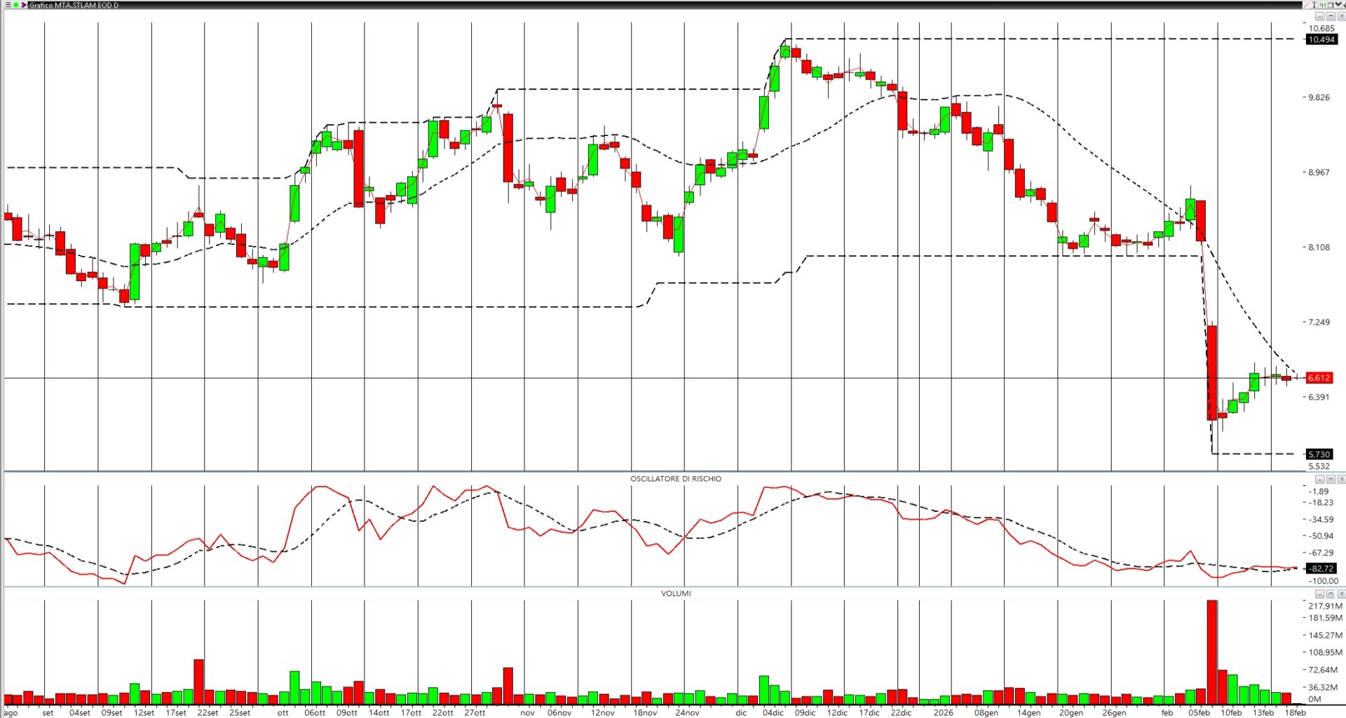 Il grafico di Stellantis mostra un trend ribassista netto negli ultimi tre mesi. Candele negative dominano da novembre 2025, con massimi e minimi decrescenti. Anche la Regressione Lineare è in pendenza negativa e sopra al prezzo e l’oscillatore di rischio che, pur essendo in ipervenduto conferma l’estrema debolezza e fragilità del titolo. Volumi importanti sulla forte discesa del 6 febbraio ma al momento non si intravedono segnali rialzisti.