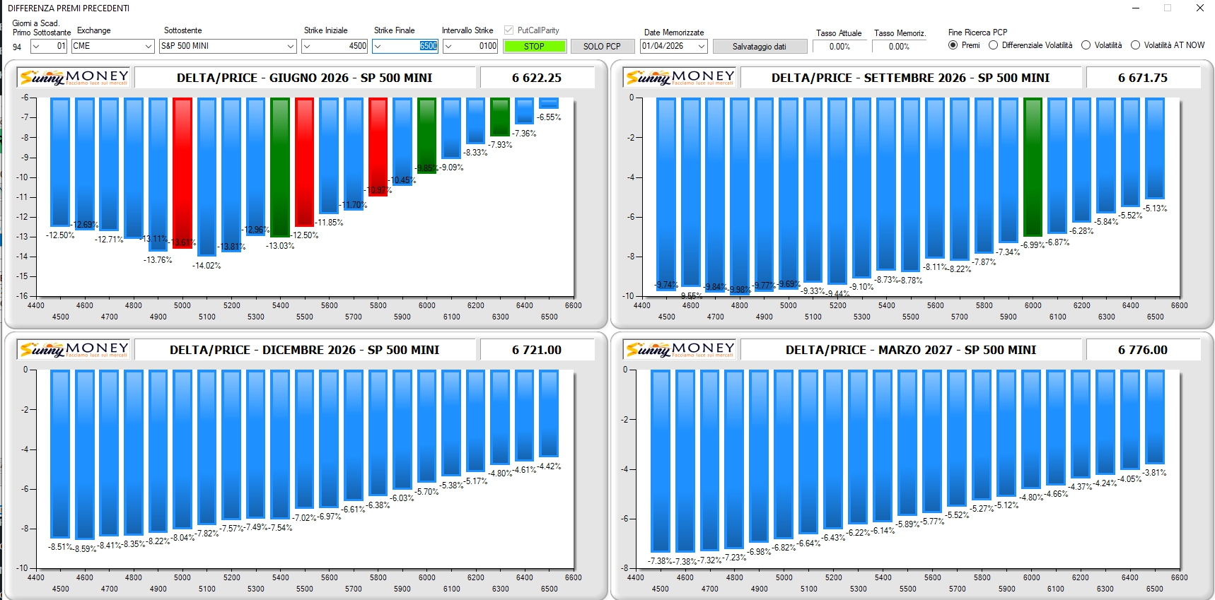 Rapporto Delta/Price che mostra un continuo calo dei premi percentualmente maggiore sulla parte sinistra della catena delle opzioni.