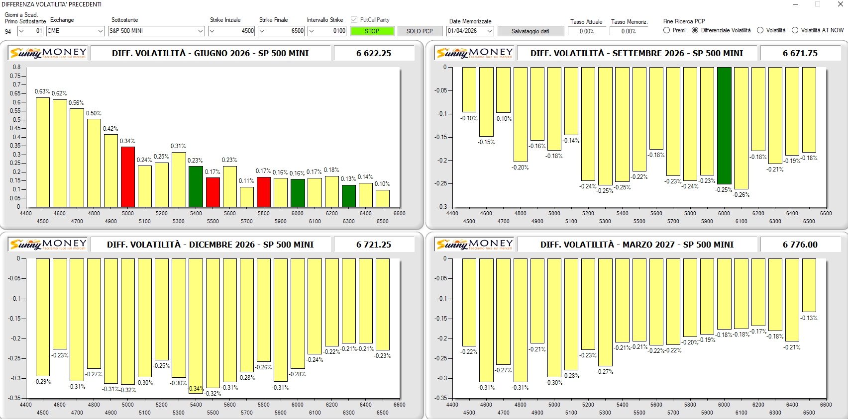 Volatilità implicita, rispetto al 1 aprile, in lieve aumento sulla scadenza Giugno e in calo sulle altre tre trimestrali senza particolari ispessimenti sul lato sinistro.